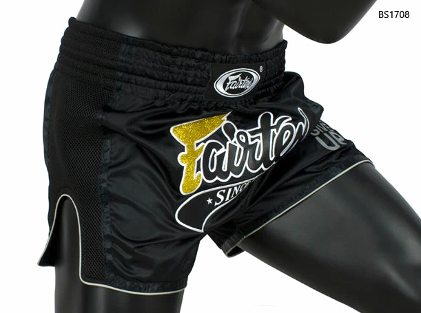 New slim cut Fairtex Muay Thai shorts with a high side slit for restricting fit. High quality satin and new style piping on the legs.