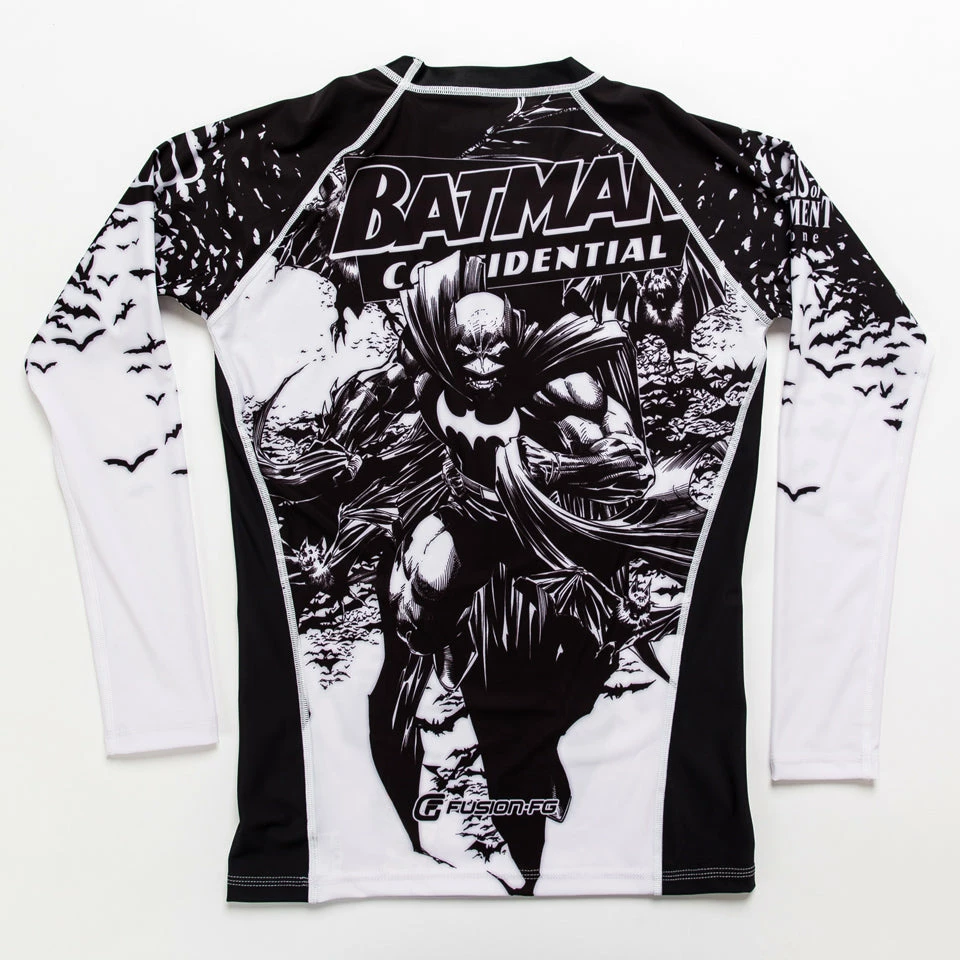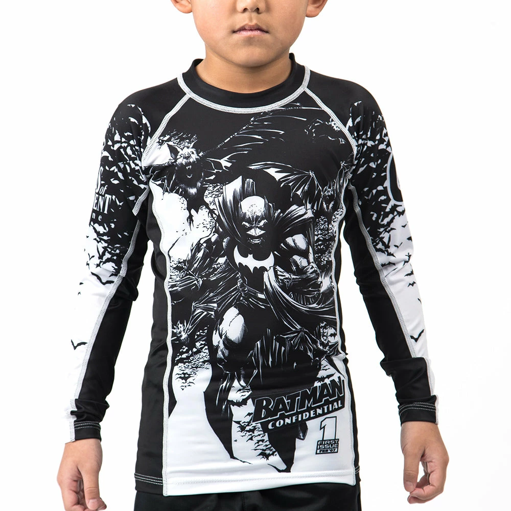 Officially licensed Batman Kids rash guard design is based on the Batman Confidential; Rules of Engagement #1 comic cover, illustrated by Whilce Portacio. The 2006 storyline features everyone’s favorite caped crusader, only a year into his crime fighting career. It details his first encounter with Superman’s arch-enemy Lex Luthor.