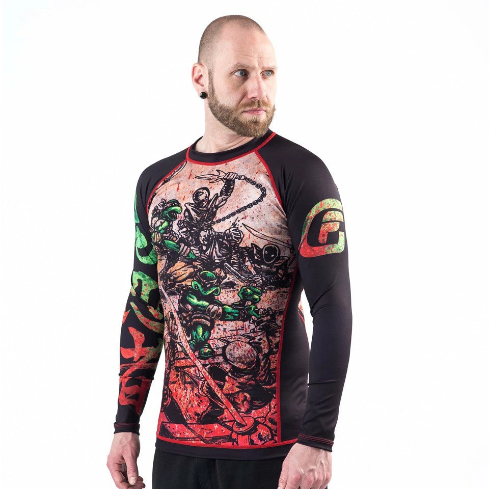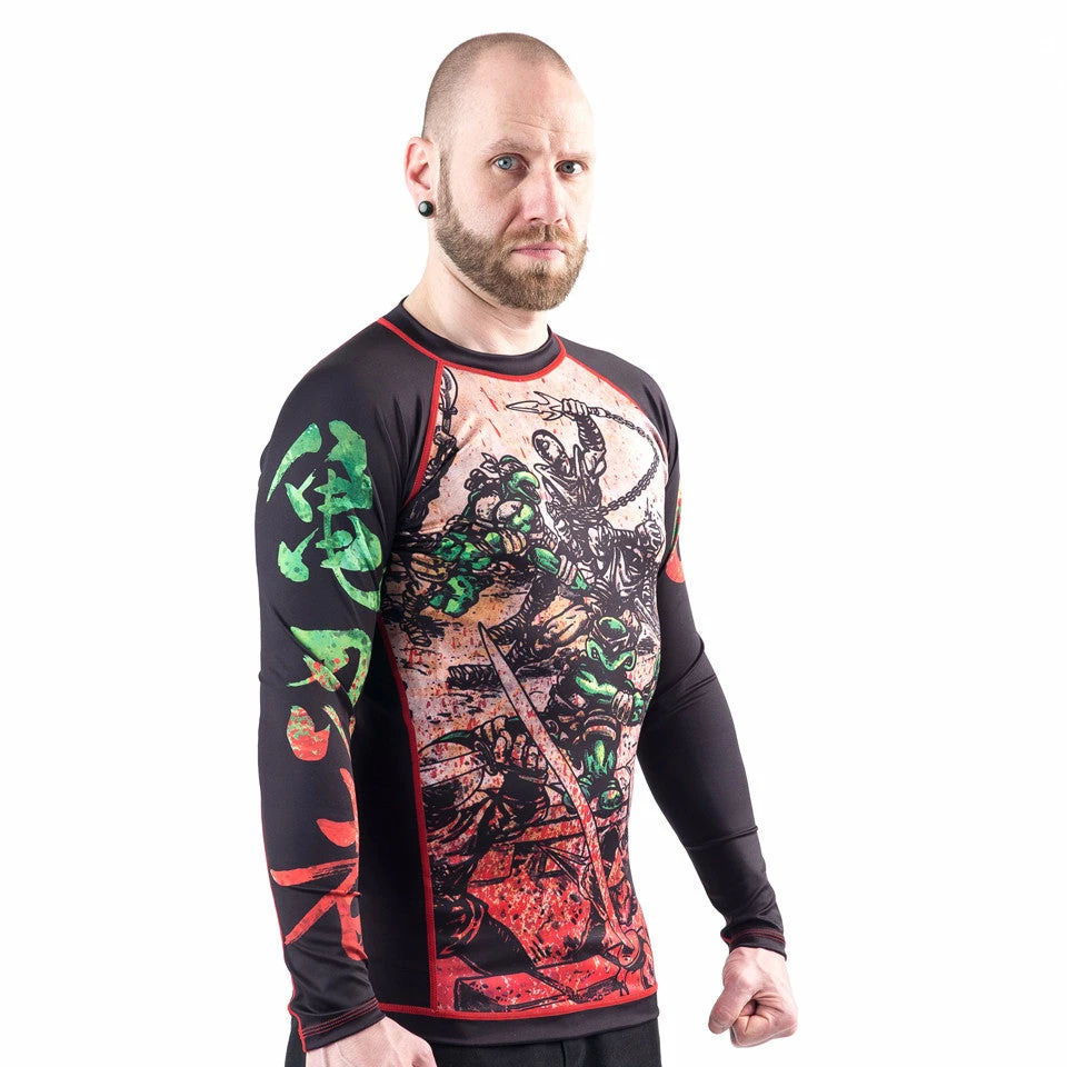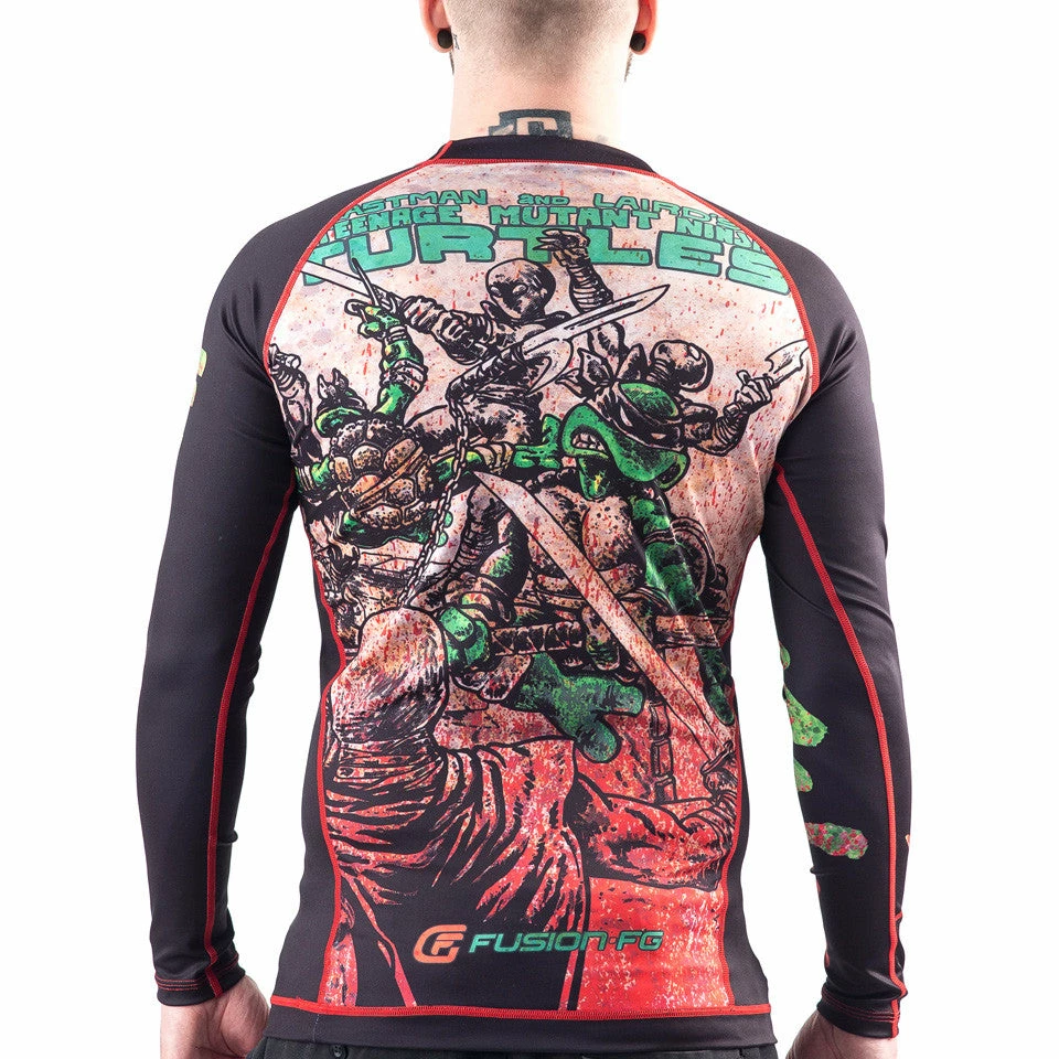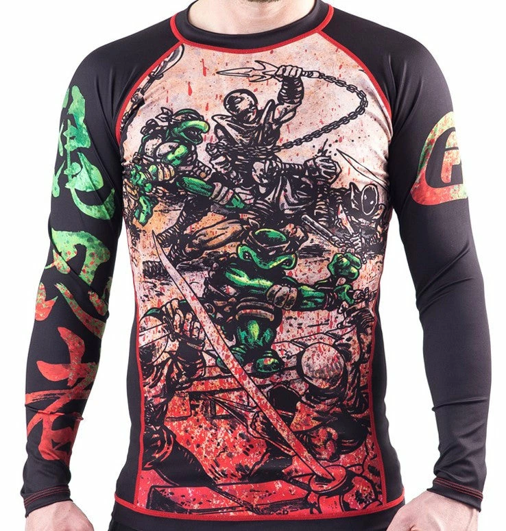 Before the colorful cartoon series, and before they ever hit the big screen, the Turtles were drawn in black and white and geared to a much more adult audience. Once color was introduced to the comics, they all wore red headbands, which made it very confusing for their girlfriends to tell them apart. For those of you who appreciate this earlier version of the Teenage Mutant Ninja Turtles, this BJJ rashguard is for you!